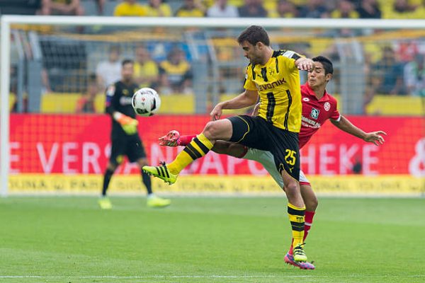 Dortmund, Germany 27.07.2016, 1.Bundesliga 1. Spieltag, BV Borussia Dortmund – 1. FSV Mainz 05, 2:1, Sokratis (BVB) gegen Yoshinori Muto (Mainz) (Photo by TF-Images/Getty Images)
